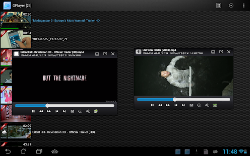 The floating system make you can move the video window position and resize the window boundary according to your personal favor. You can also play with full screen or minimize the playing video to the system notification tray . If your device is strong enough, you can also play the video with "Multi-Window"(Maximum is 6). It means you can watch up to six video files at the same time.